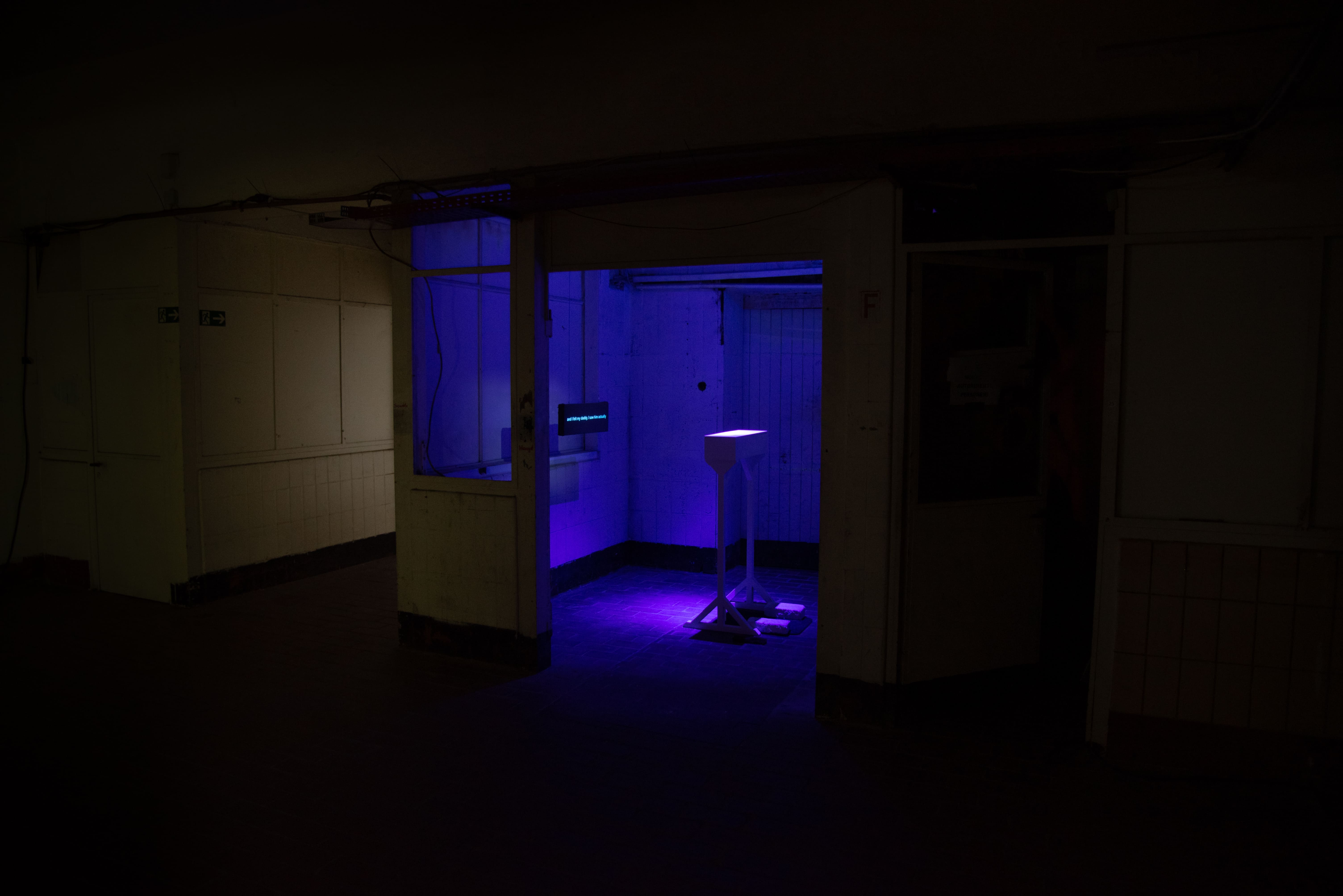Projection on reflective screen, UV light, bone conducting transducers, wooden structure, 2023.